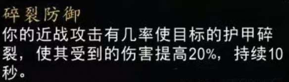 你的近戰(zhàn)攻擊有概率是目標(biāo)的護(hù)甲碎裂,使其受到的傷害提升20%,持續(xù)10秒。