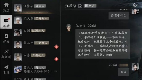 江拾柒這個江湖故人在白雀經閣西邊找到,他一直躺在冰面上不起來,玩家們只需要問問他干嘛要這樣獲得原因就可以成功結交了,還沒有結交成功的玩家們可以在下面參考話術。