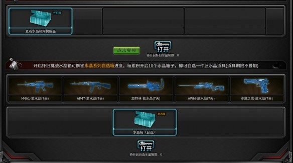 完成懷舊挑戰地圖可獲得水晶寶箱,10個寶箱可合成自選箱(含藍水晶系列武器),武器使用期限可通過開箱疊加延長。