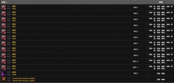 受制技能:撕咬、蛛網、Tamed Pet Passive