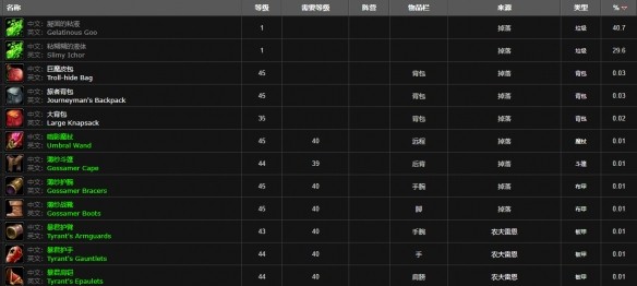 大概率掉落蜘蛛的毒液,松脆蜘蛛腿等食物,小概率掉落20級裝備以及寶石等道具。