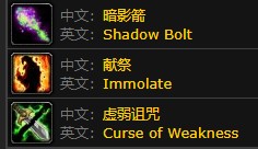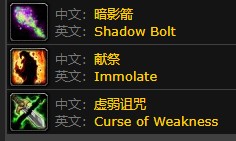 1、技能:暗影箭、獻祭、虛弱詛咒。