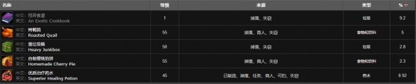 3、掉落:符文布、烤鵪鶉、公式:附魔護腕 - 超強力量、晨露酒、特效治療藥水等。