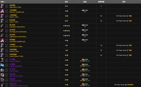 可學會:初級裁縫、大師的魔線、大師級裁縫、高級裁縫、黑光刺繡、劍刃刺繡