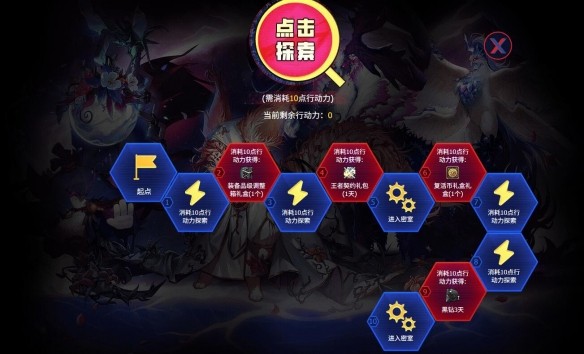 3、消耗10點行動力可探索一次,一些額外的紅色格子消耗行動力還有額外的獎勵;