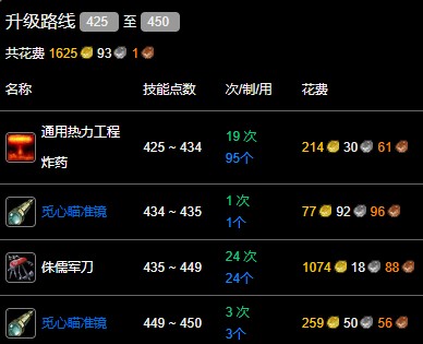 wlk附魔425-450沖級(jí)難度比較大,有玩家不知道wlk附魔425-450怎么沖?大家可以制作通用熱力工程炸藥、覓心瞄準(zhǔn)鏡、侏儒軍刀,這些道具可以幫助我們快速升級(jí),下面就來(lái)看下具體操作方法。