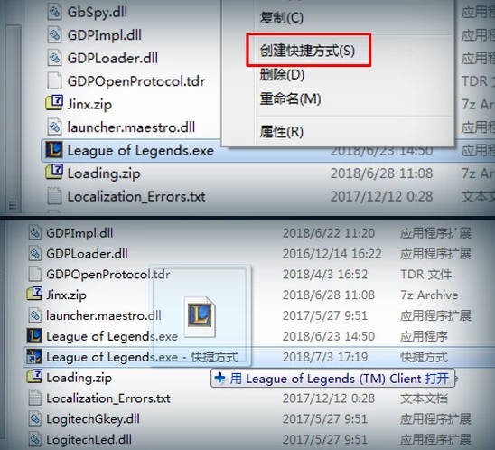 右鍵游戲安裝目錄下的 英雄聯盟GameLeague of Legends.exe,創建快捷方式。
