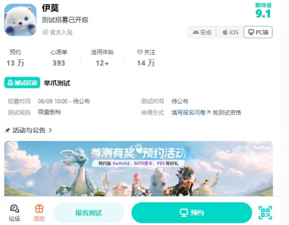 1、打開伊莫的TapTap頁面,下方有個報名測試按鈕,點擊一下。