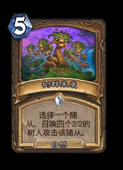5費(fèi):選擇一個(gè)隨從。召喚四個(gè)2/2的樹人攻擊該隨從。