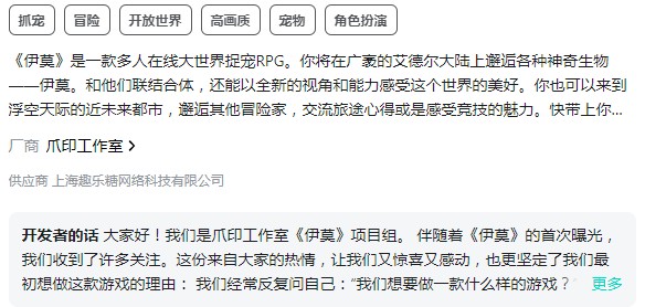 伊莫的畫風也太精致了吧,那么這款游戲是哪個公司的呢?它是由杭州爪印工作室開發的,工作室成員們擁有豐富的開放世界與二次元游戲開發經驗,會持續打磨這款作品,期待它的面世。