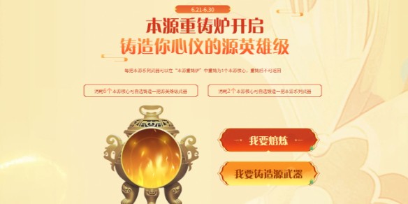 全新的本源重鑄爐活動將會上線,這個新的活動當中玩家們可以將領取的本源系列武器在重鑄爐中重鑄為1個本源核心,當消耗6個本源核心就可以鑄造一把源英雄級武器,具體的內容可以一起來了解一下吧。