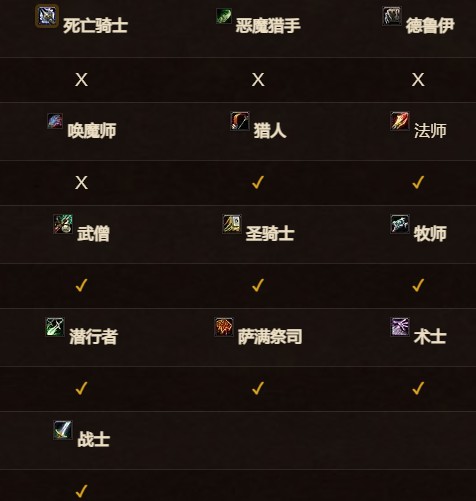 獵人、法師、武僧、圣騎士、牧師、武僧、圣騎士、牧師、潛行者、薩滿、術士、戰(zhàn)士。