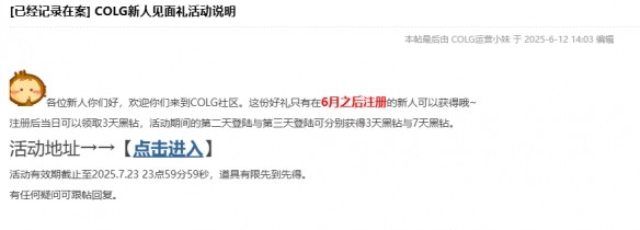 DNF官方論壇COLG開啟了6月新人見面禮活動,那么該活動內(nèi)容有什么呢,6月之后注冊的新人才能參與本次活動,注冊后在該頁面每天都可以領(lǐng)取1次黑鉆的獎勵,一共13天黑鉆,以下就是詳細的介紹。