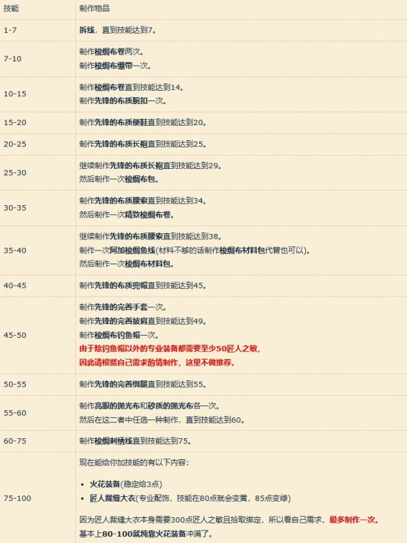 45-50:制作先鋒的完善手套一次,制作先鋒的完善披肩直到技能達到49,制作梭綢布釣魚帽一次。(由于除釣魚帽以外的專業(yè)裝備都需要至少50匠人之敏,因此請根據自己需求酌情制作,這里不做推薦)