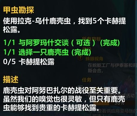 4、如果玩家還是無法完成,查看【甲蟲勘探】和【松露大掃除】這兩個任務是否同時存在,如果存在先放棄任務【甲蟲勘探】,完成世界任務【松露大掃除】之后再去接取【甲蟲勘探】即可完成這個任務。