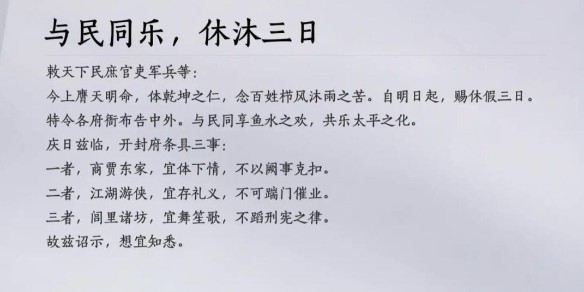 近日玩家們在游戲公告當中收到了有關于休沐三日的信息,很多玩家不清楚休沐三日是什么意思,這個指的是在游戲當中開封府讓官府的人全部休息三天放假與民同樂。