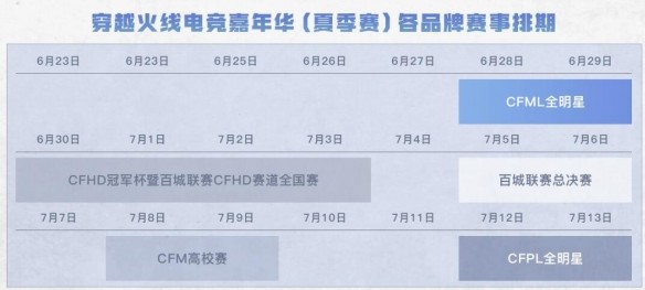 3、其中百城聯賽在7月5日-7月6日舉行。CFPL全明星在7月12日-7月13日舉行。
