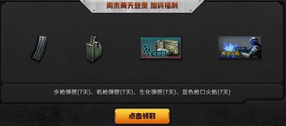 2、兩天全部登錄就可以額外領取步槍彈匣(7天)、機槍彈匣(7天)、生化彈匣(7天)、藍色槍口火焰(7天)。