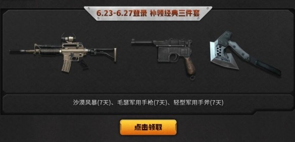 3、6.23-6.27登錄補領沙漠風暴(7天)、毛瑟軍用手槍(7天)、輕型軍用手斧(7天)。