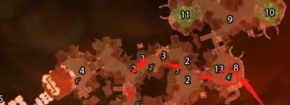 3、進來之后從圖中的箭頭方向繞彎一直向右邊走,走到右下角的4號位置。