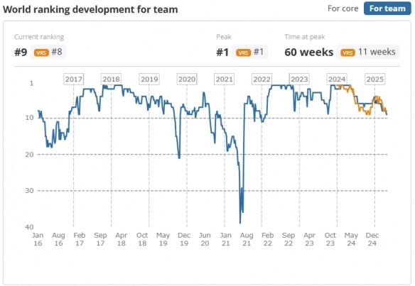 這支隊伍依然分崩離析,兩位核心老將rain和karrigan狀態不在,新陣容的戰術體系遲遲無法進入狀態,雞哥的加盟反而讓所有人因為位置變更受到禁錮。ropz的出走、寒王的疲軟、broky的心魔和不適應是這支隊伍瀕臨崩潰的前兆,除非大換血,否則傳奇戰艦將就此隕落。