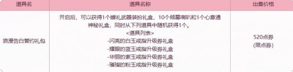 1、活動(dòng)期間將上架浪漫告白誓約禮包,售價(jià)520點(diǎn)券,開啟后可獲得婚禮武器裝扮等獎(jiǎng)勵(lì);