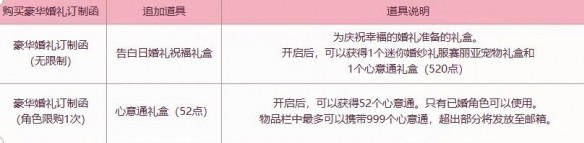 3、【豪華婚禮訂制函】分為無限制購買和限購一次,限購一次的可以獲得52個(gè)心意通;