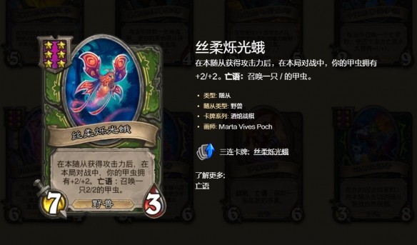 2、絲柔爍光蛾每次獲得攻擊力都會讓甲蟲+2+2,我們可以通過遺骸看管者+古墓搗蛋鬼+瑞文戴爾的方式來快速的提升絲柔爍光蛾的攻擊力。
