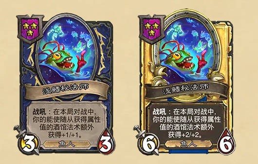 · 改動前:在每次刷新后,使酒館中的魚人獲得+2/+2和一個隨機額外關鍵詞。