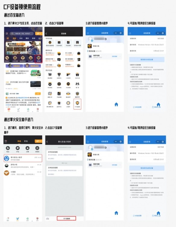 設(shè)置路徑:通過(guò)【騰訊游戲安全中心】微信公眾號(hào)(路徑:自助服務(wù)→賬號(hào)安全→設(shè)備管理→穿越火線→綁定設(shè)備)或掌火APP完成。